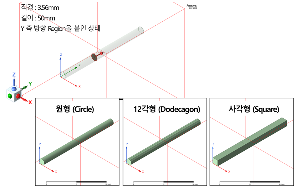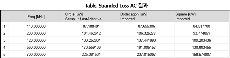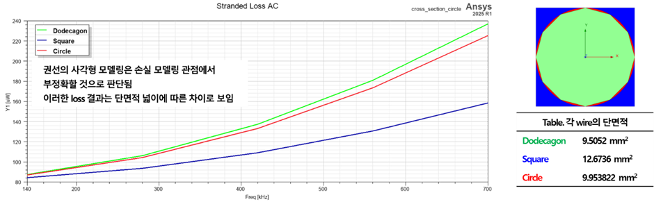 원형, 사각형, 12각형 단면에 대해 Loss를 비교하면, 사격형은 손실이 작게 나오므로 단순화 작업에는 원형보단 12각형이 적절할 것으로 확인됩니다.