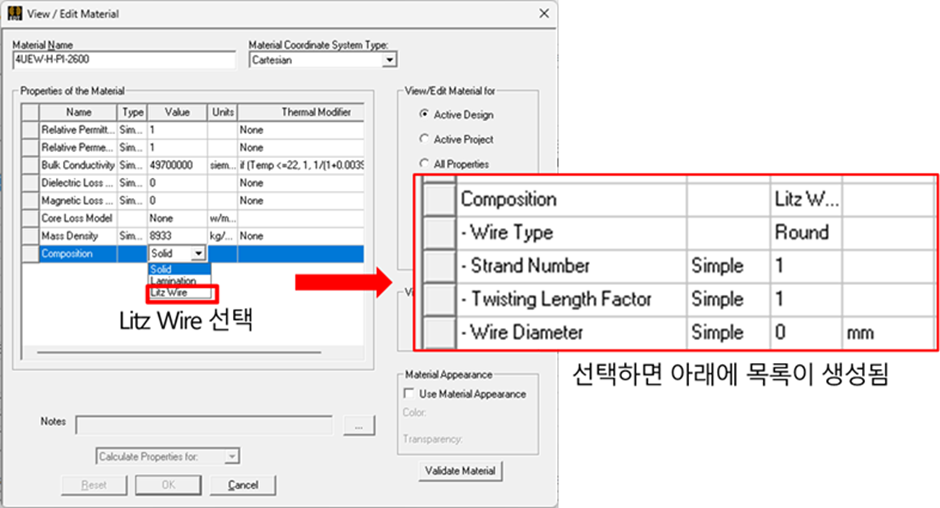 Edit Materials에서 Litz wire를 적용해줍니다.