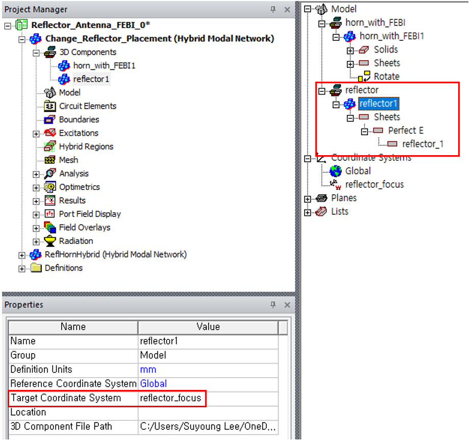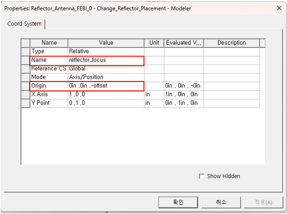 Reflector와 Horn Antenna 사이의 거리를 변수화 하기 위해 Reflector의 Coordinate System을 따로 설정하고 Reflector의 위치를 -offset으로 설정합니다.