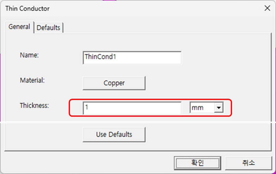 • Thin Conductor 창에서 material(재질)을 Copper로, Thickness(두께)를 0.1 mm로 설정되어 있는지 확인합니다.