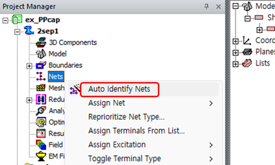 •Project Manager에서 Nets를 마우스 오른쪽 버튼으로 클릭하고 Auto Identify Nets를 선택합니다.