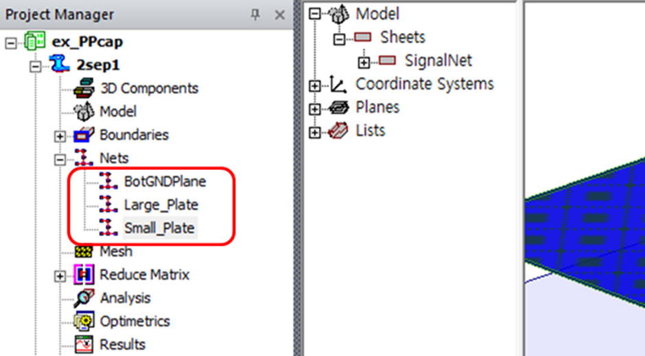 그러면 3D Modeler Tree에 표시되는 시트 객체 이름을 기반으로, 세 개의 Net 이름이 Project Manager에 나타납니다.