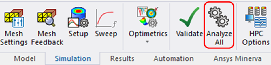 •Validate 오른쪽의 Analyze All을 클릭하여 Q3D 시뮬레이션을 시작합니다.