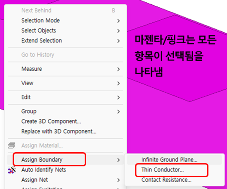 • 3D Modeler에서 마우스 오른쪽 버튼을 클릭하고 Assign Boundary → Thin Conductor… 를 선택하면 Thin Conductor 창이 열립니다.