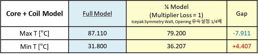 류세환 | 2025년 10월 10일본 해석에서는 External Circuit 기능을 이용하여 변압기의 1차측에 전원 조건을 외부 회로로 구성하고, 2차측 부하를 회로 요소로 구현하였습니다. 이를 통해 Maxwell 내부에서 복잡한 Excitation 설정 없이도 운전 조건을 손쉽게 적용할 수 있습니다. 또한 변압기의 구조적 대칭성을 고려하여 ¼ 모델 기반 해석을 수행하였습니다. 모델을 Split 기능으로 분할한 후, 대칭면에는 Symmetry Boundary를 설정하고, Icepak에서도 동일하게 Symmetry Wall을 적용하였습니다. Opening 조건의 유속 역시 대칭 구조에 맞게 재조정하여 열-유동 해석의 일관성을 확보하였습니다.