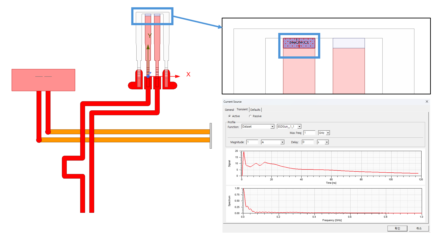 ESD Gun의 Waveform 데이터 시트를 import하여 ESD를 발생시키고 싶은 위치에 Excitaion(Current Source)을 설정합니다.