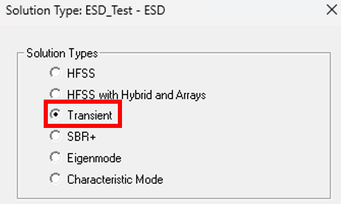 먼저 Time Domain 해석을 진행하기 위해 Solution Type은 Transient로 설정합니다.