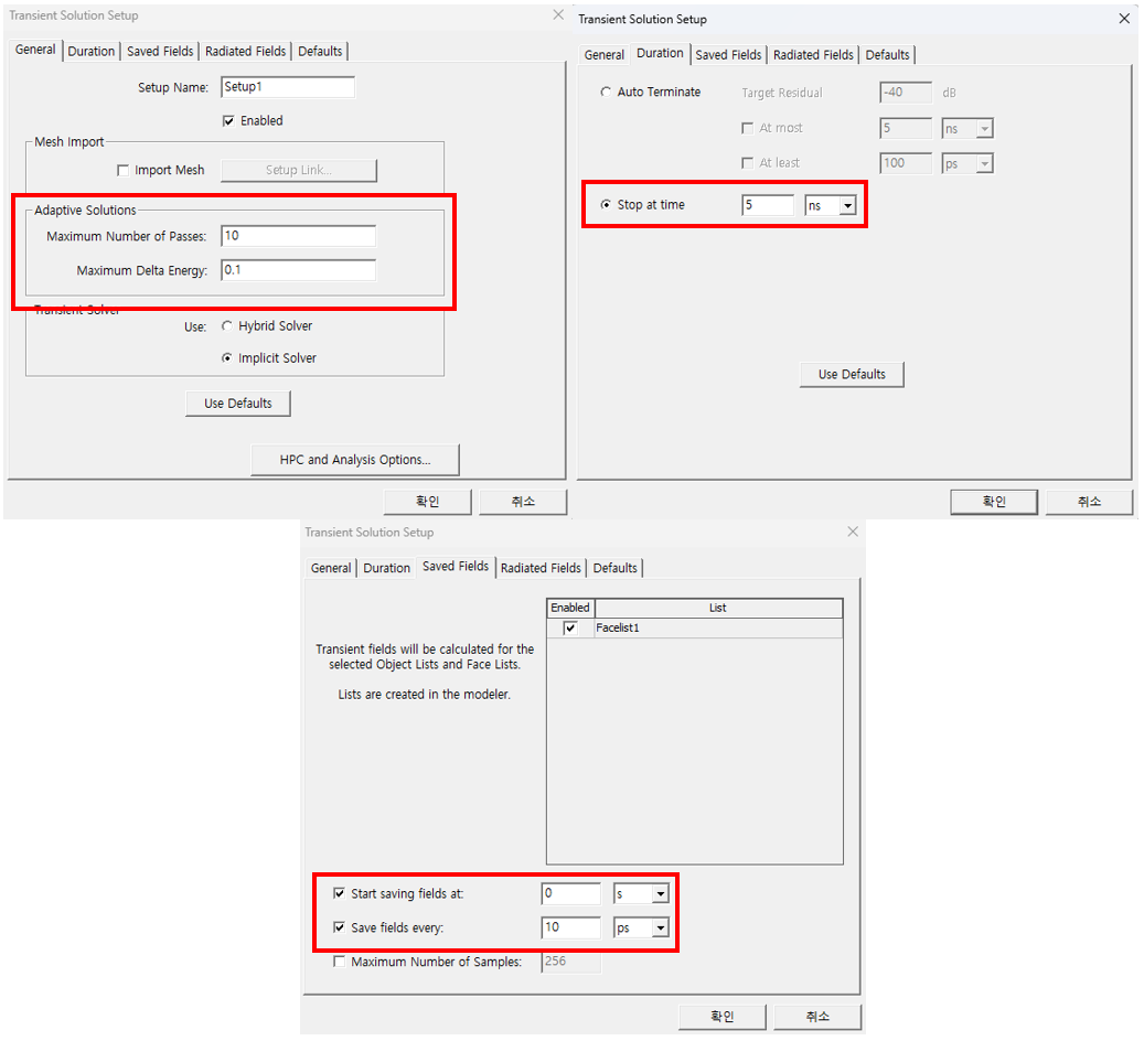 Analysis Setup의 경우, Maximum Delta Energy를 0.1로 설정하고, Transient 해석의 Stop Time을 5ns로 설정하였습니다. 또한 Saved Fields tab에서 앞서 설정한 Facelist를 선택하고 Field를 저장하기 시작할 시간과 저장 간격을 각각 0s, 10ps로 설정합니다.