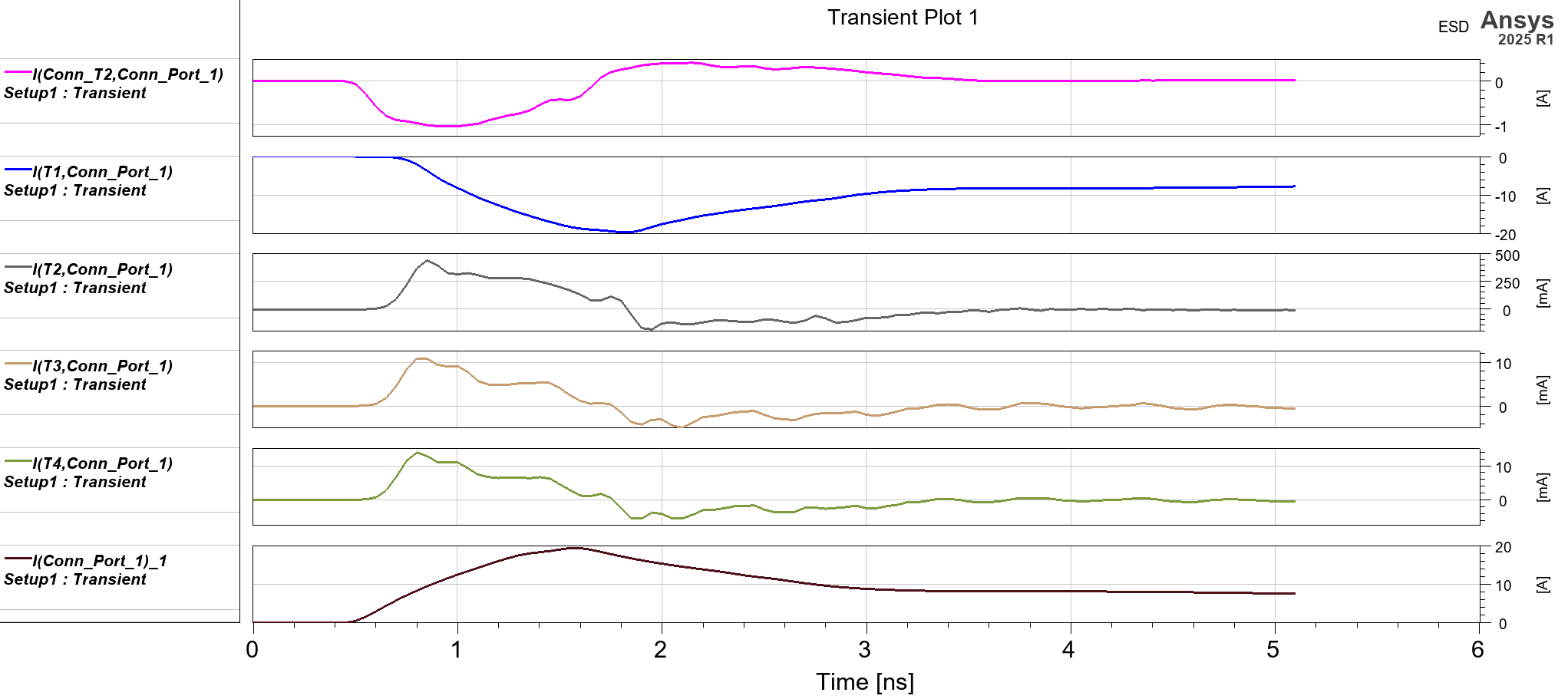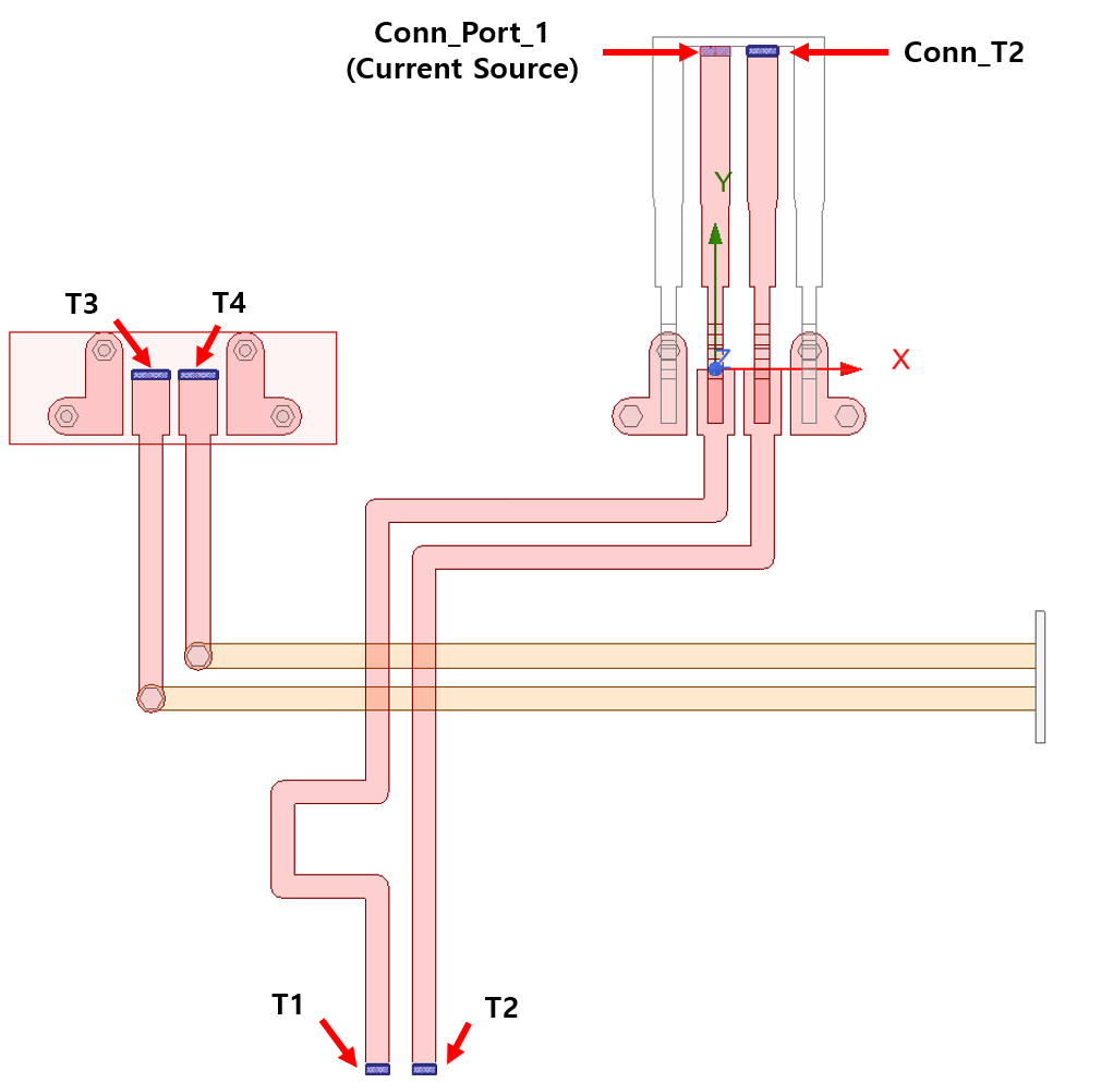 Current Excitation이 설정된 Trace의 T1은 Exitation과 같은 20A가 흐르고, 그 외의 다른 Trace에서는 커플링으로 인해 약 10mA - 1mA가 흐르는 것을 확인할 수 있습니다. 또한 Conn_T2와 T2를 보면 Discharge Point와 가까운 Conn_T2에는 1A, 먼 T2에는 500mA가 흐릅니다.