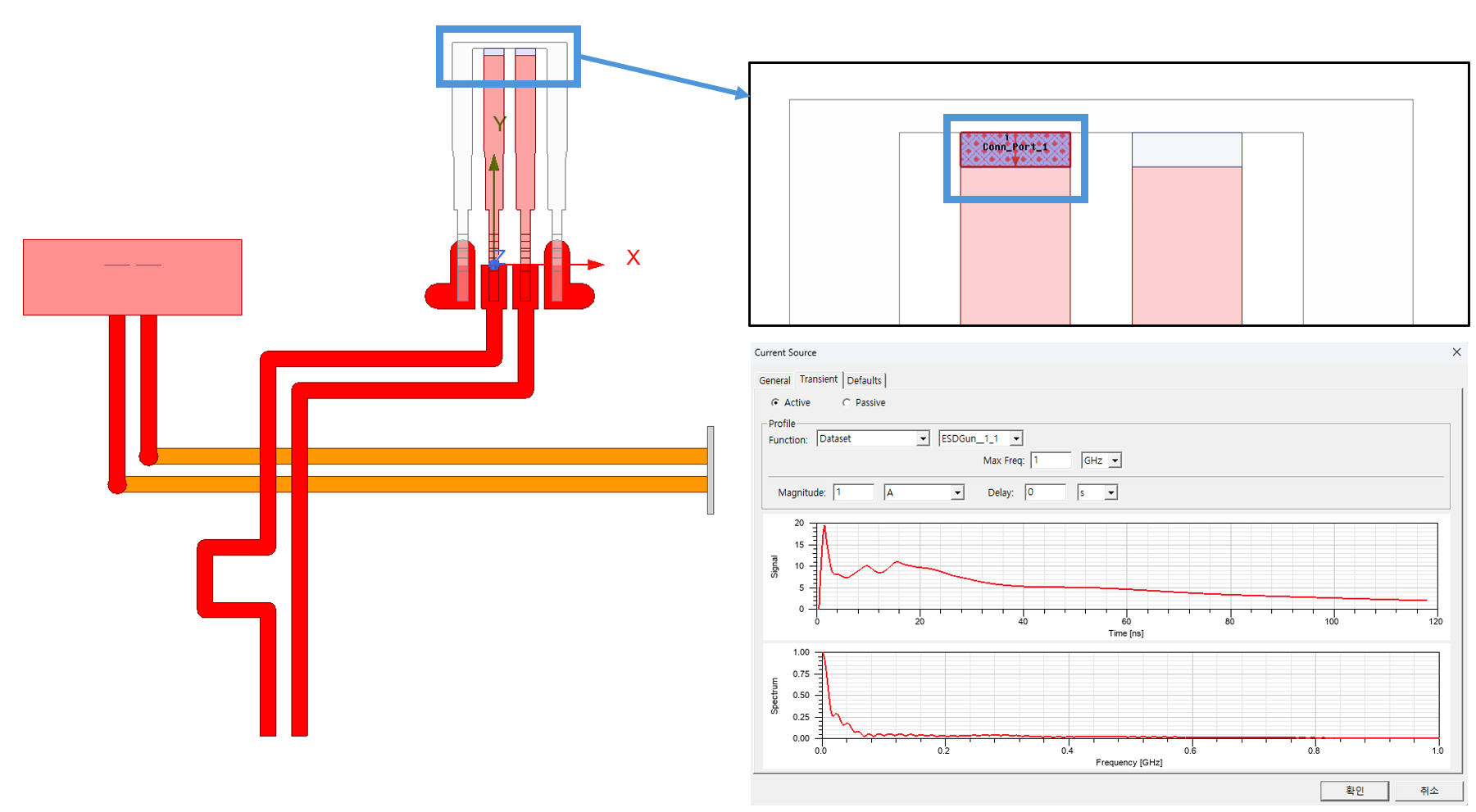 먼저 아래와 같이 ESD를 Discharge하려는 부분에 ESD Gun의 파형을 Current Source로 넣어줍니다.