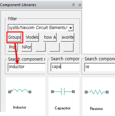 - Ansys Circuit에서 Lumped Element R, L, C는 우측 Component Libraries에서 Groups 클릭 후 검색을 하면 찾을 수 있습니다.