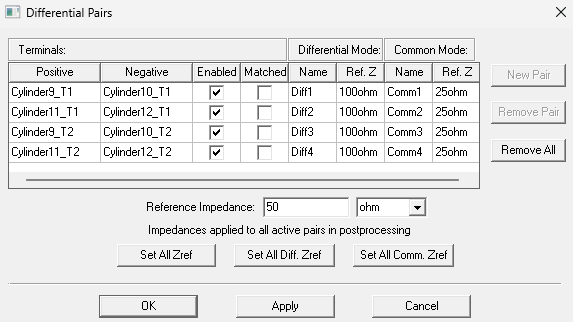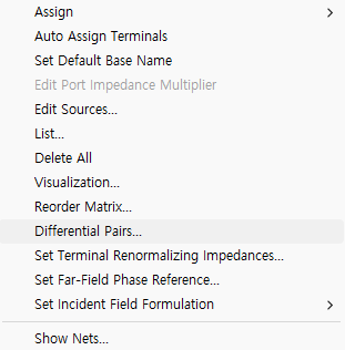 이때, Excitations 우클릭 후 Differential Pairs 설정을 하면, 이후 Result를 볼 때 각 포트가 Differential Line으로 분류된 결과를 확인할 수 있습니다.