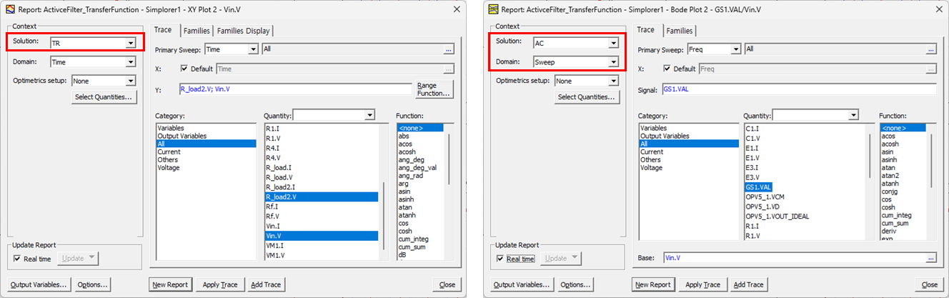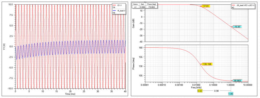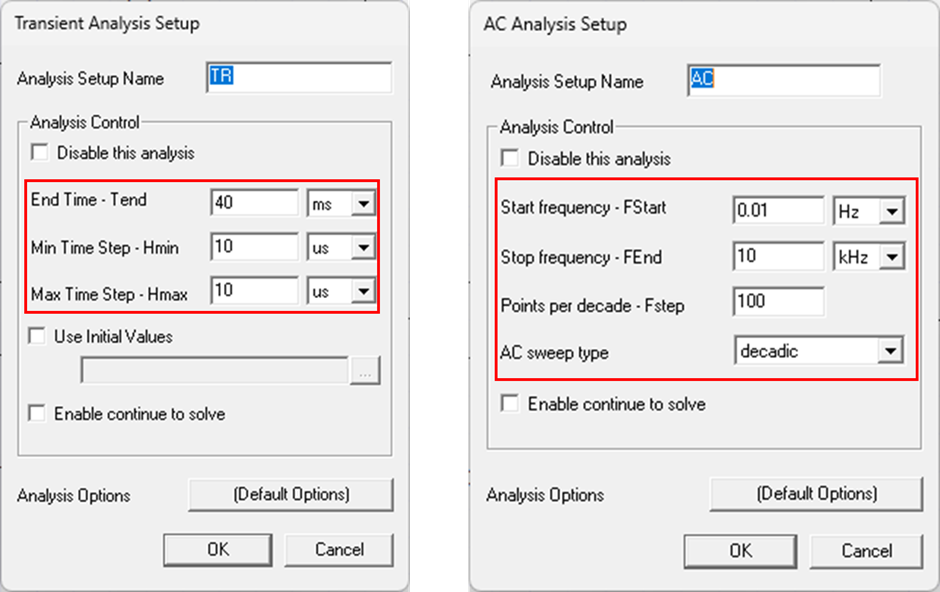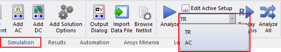 Transient 해석과 Ac해석을 모두 수행하기 위한 solver setup → 시간에 따른 결과(TR) / Bode plot(AC)을 다음과 같이 진행합니다.