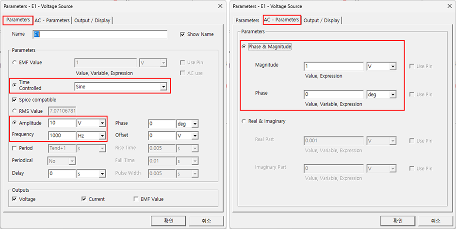 Voltage Source를 더블 클릭하고 the Parameters Tab을 선택한 후 다음과 같이 설정합니다.