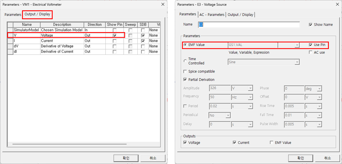 • VM1 Voltage미터 더블클릭 → “Output/Display” tab선택 → Voltage변수 V에 “Show Pin”