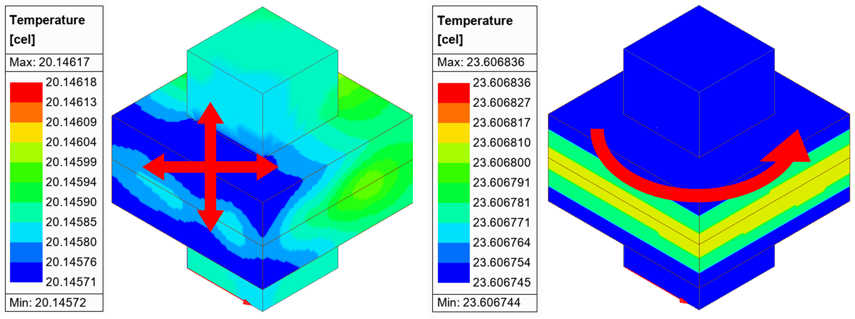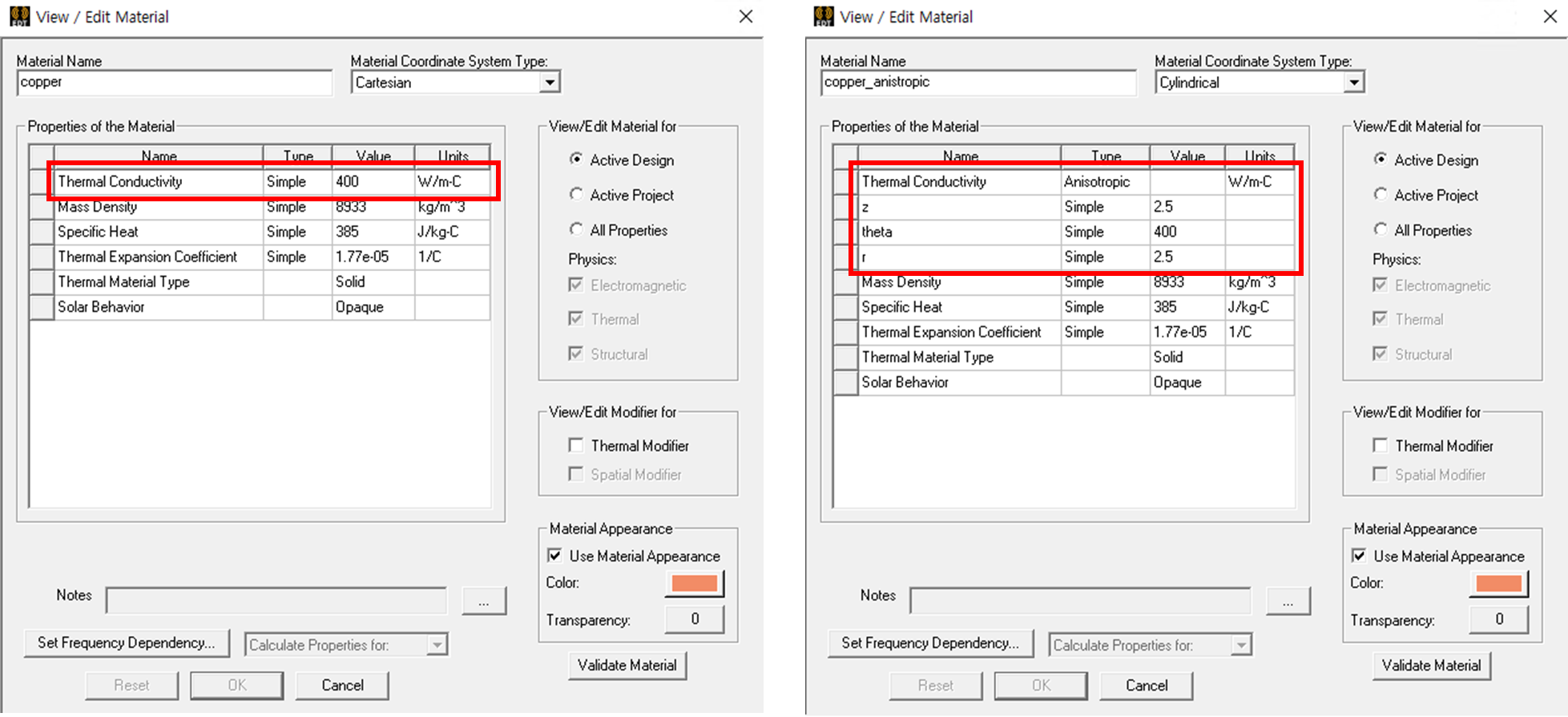 등방성(Isotropic) 해석은 구리의 열전도율을 400 W/m·K로 입력하였고, 방향성(Anisotropic) 해석은 Cylindrical Coordinate System을 기준으로 z = 2.5, theta = 400, r = 2.5 W/m·K를 적용하였다.