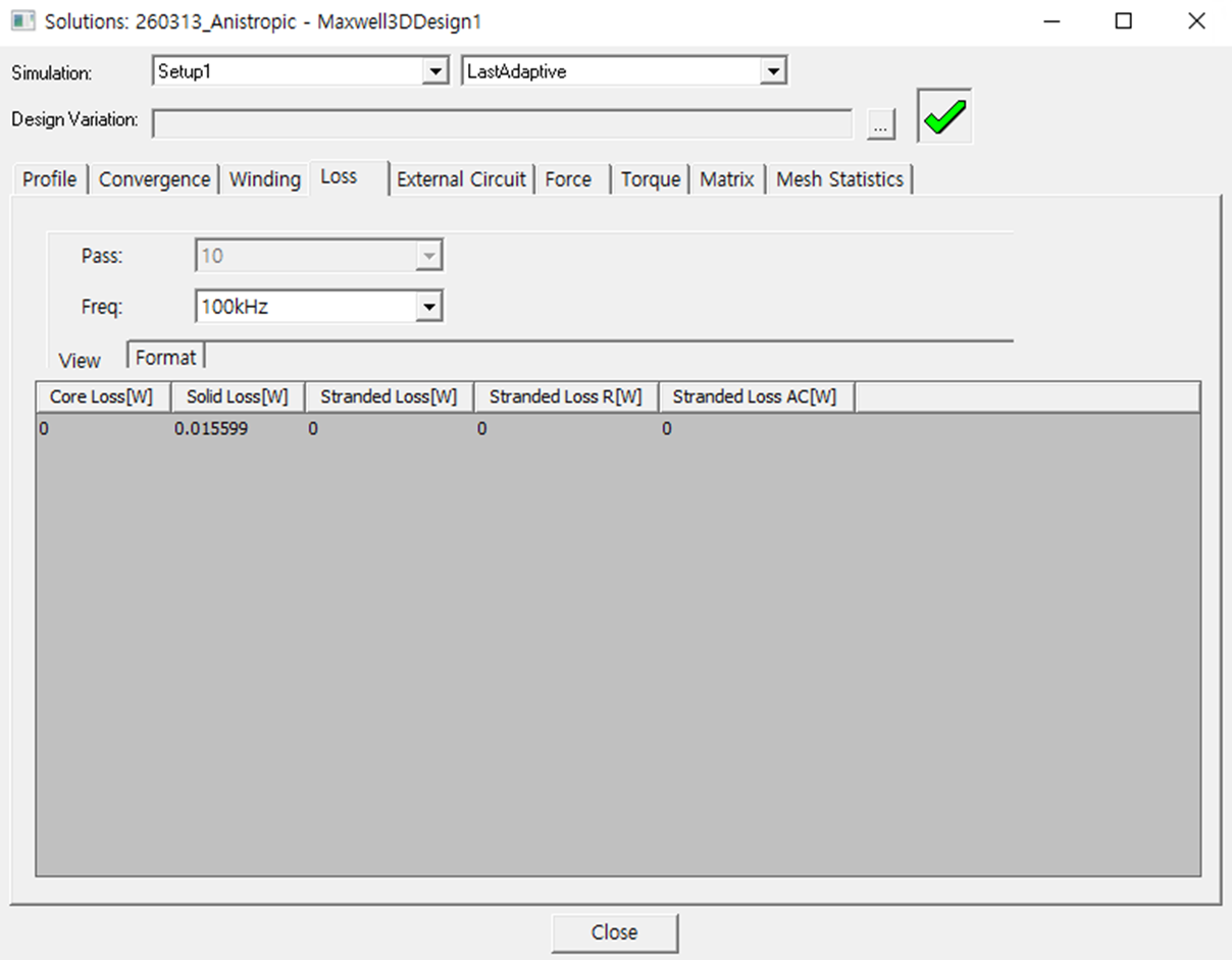 100 kHz 조건에서 권선 손실은 약 0.0156 W로 계산되었으며, 해당 손실 값을 Icepak 열해석 입력 조건으로 사용하였다.