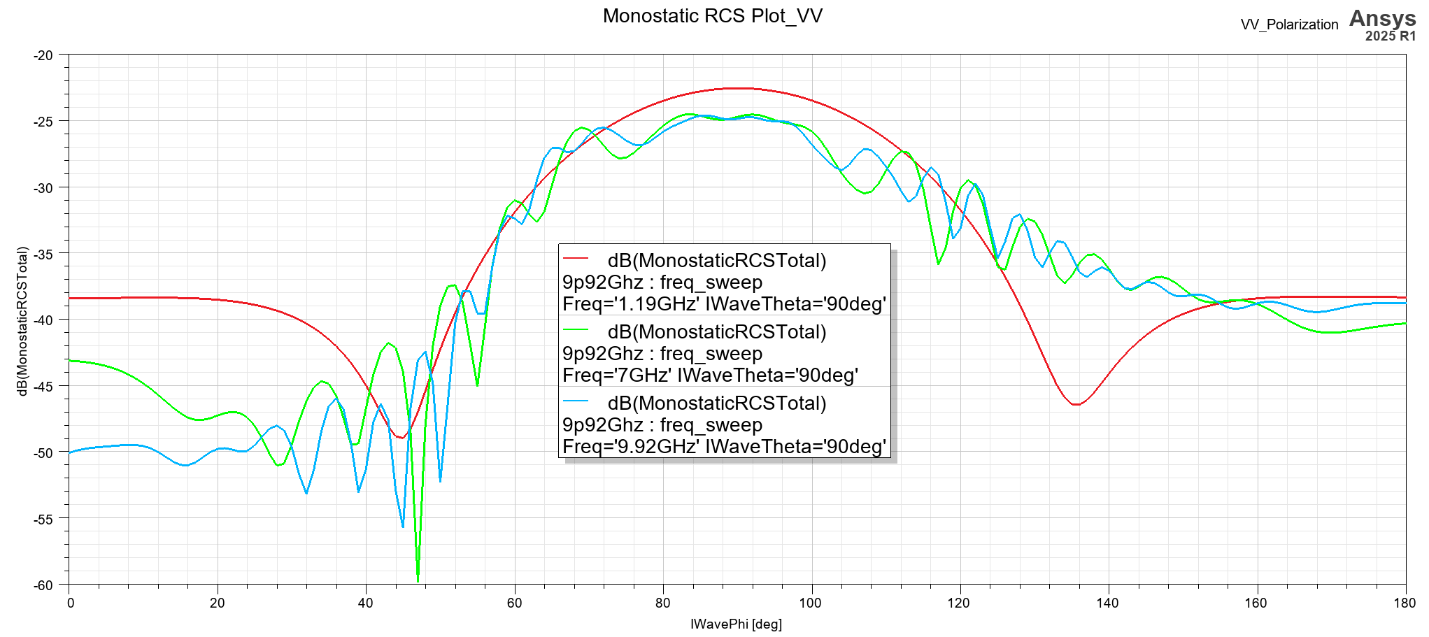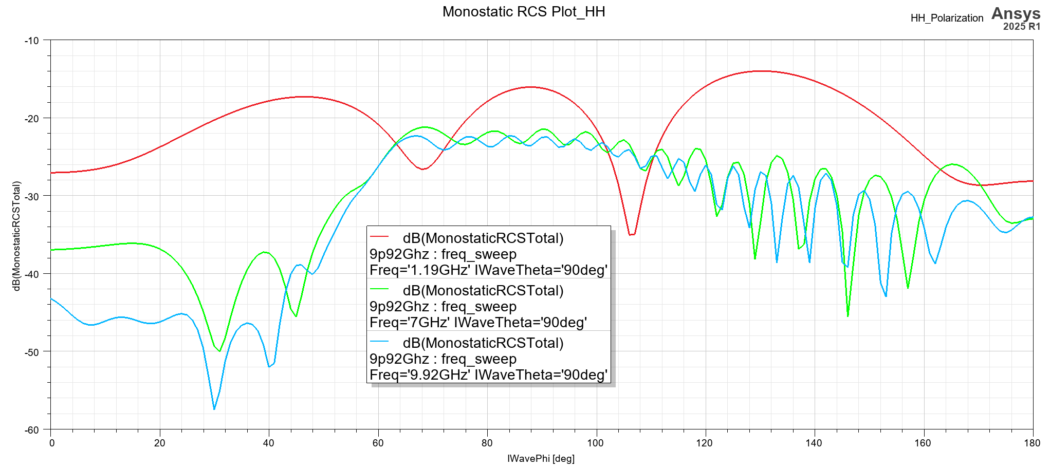 입사파가 수평 편파, 수직 편파일 때의 RCS 결과를 주파수별로 비교할 수 있습니다.