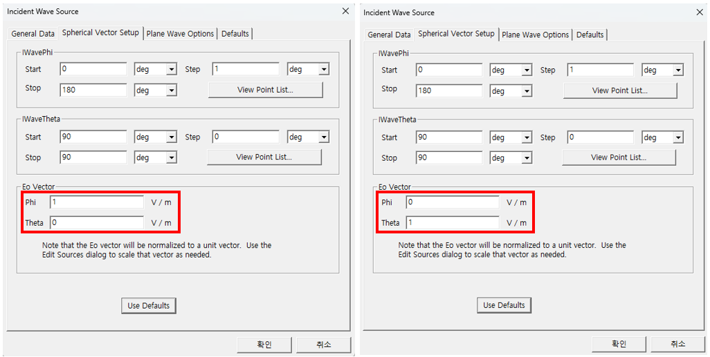 Sphectical Vector Setup 탭의 E0 Vector를 이용하여 편파를 설정합니다.