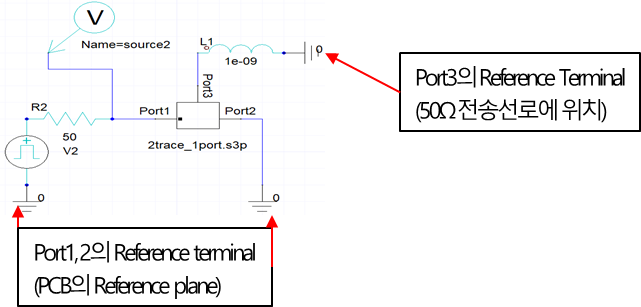 - 우측 그림과 같이 Port3에 연결된 GND symbol은 PCB의 Reference plane과 다르며, Port의 Reference terminal을 의미