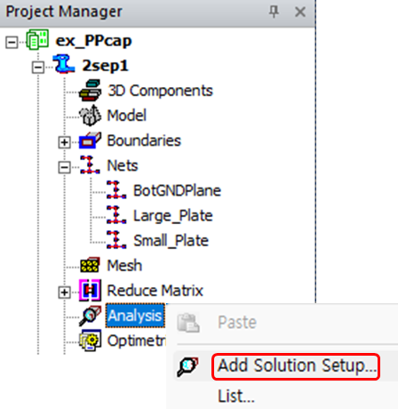 Project Manager에서 Analysis를 마우스 우클릭하고 Add Solution Setup을 선택하여 Solve Setup 대화상자를 엽니다.