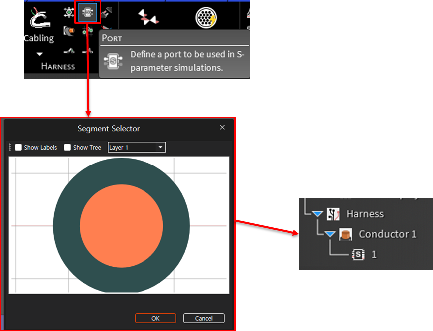 - 위 그림처럼 케이블의 단면 창이 나오면 Port를 적용시키고자 하는 Conductor(그림에서 클릭)를 선택합니다.