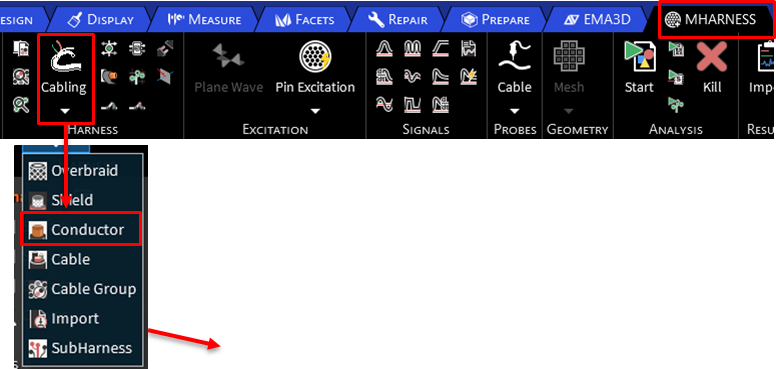 - 상위 Mharness탭에서 Cabling을 선택 후 Conductor를 클릭합니다.