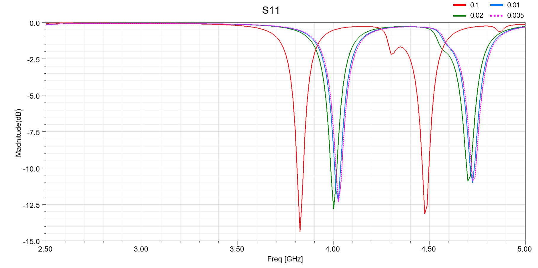 먼저 Maximum Delta S 값(이하 '값'이라 칭함)이 0.1일 때는 그 외의 경우와 공진 주파수가 약 0.2GHz(5%) 작은 것을 확인할 수 있습니다. 값이 0.02일 경우 0.01, 0.05일 때와 유사하나 동일하지는 않고, 값이 0.01, 0.005일 때는 S11 값이 완전히 일치하진 않지만 공진 주파수는 동일합니다.