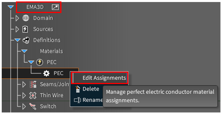 1. EMA3D Tree - Definitions - Materials - 물성 우클릭 - Edit Assignments