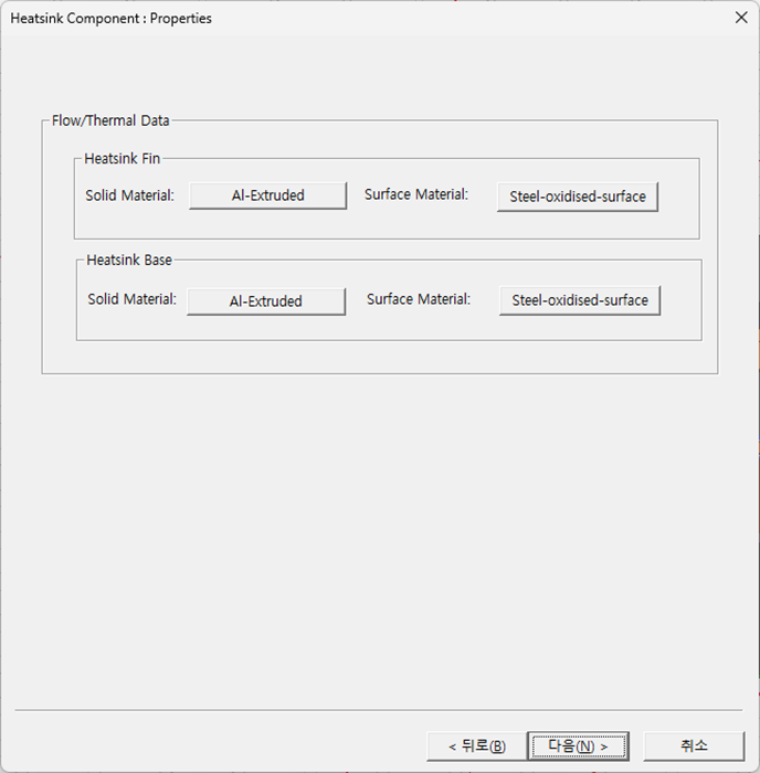 9. Flow/Thermal에서 Base Material과 Fin Materials를 클릭하여 Select Definition 대화상자를 열고 Materials 탭에서 재질을 선택하고 다음을 클릭합니다.