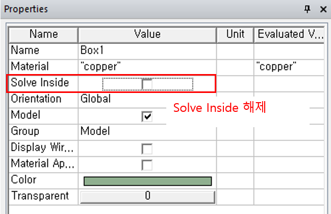 4. 물체의 Properites에서 Solve Inside 체크 해제