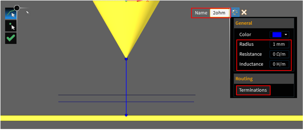 Line 선택 후 Name, Radius, Resistance(ohm/m), Inductance(H/m)를 설정합니다.