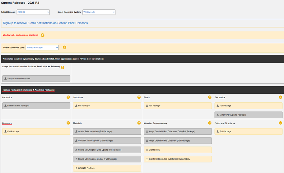 이 문제를 해결하려면 Ansys 다운로드 페이지를 방문하여 ‘Primary Packages’탭(아래 그림 참조)에서 Ansys Discovery를 다운로드 및 설치를 진행해주세요.