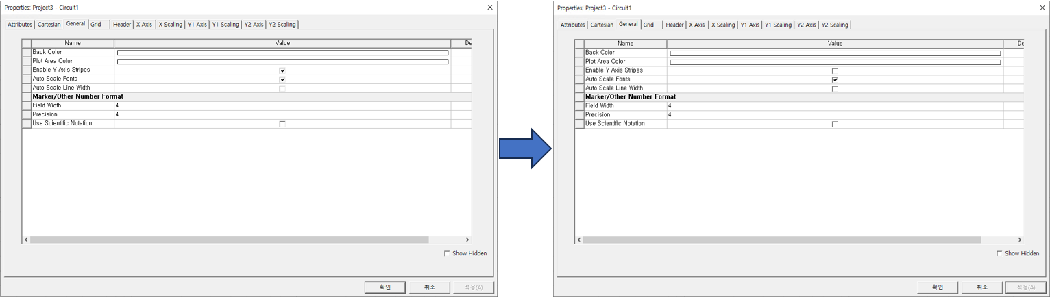 Y축에 표시되는 색상을 제거하려면 그래프의 Properties에서 General 탭의 Enable Y Axis Stripes 옵션의 체크를 해제하면 된다.